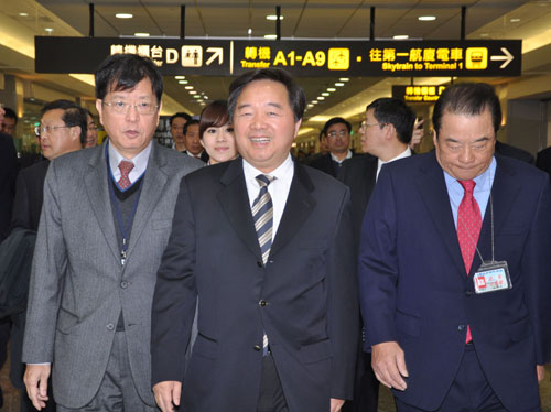 南京市长季建业(前中)率领经贸考察团15日搭机抵台,随行企业还包含苏宁电器集团、南京中央商场集团等。 图片来源:“中央社”