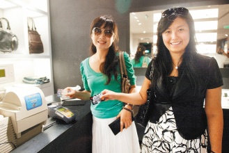 银联卡在台湾开通三个多月,到上周为止,银联卡累积刷卡金额已突破7亿多元、笔数7万多笔,平均每笔消费金额新台币1万多元。图为大陆游客出示银联卡。台湾联合报系资料图