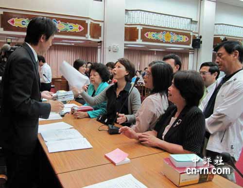 资料图:绿营阻挠大陆学生来台就学,主席黄志雄要宣布议事规则,“绿委”就是不让主席说话。