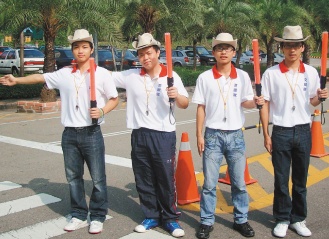 来自福建省漳州职业技术学院的林少玮、王智鹏、陈志荣、陈灿鑫,来台读大学,最近加入“交通服务队”社团,经过1周训练,实际站上路口。