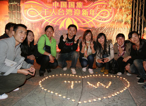 由国旅集团组成的千人陆客团,29日在苗栗县晚宴,部分团员用蜡烛排成中间具有“TW”字样的爱心图样,欢喜迎接将在台度过的跨年夜。