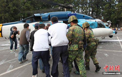 4月27日,台湾阿里山景区发生小火车翻车事故,现场被当地警方封锁。下午5点,最后两个大陆游客遇难者遗体被抬上直升飞机。中新社发 沈存旭 摄