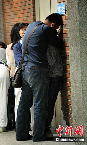 首批阿里山小火车意外死者家属,29日早上到殡仪馆认尸。当家属看见死者遗体后,均在门外悲伤抱头痛哭。中新社发 谭达明 摄
