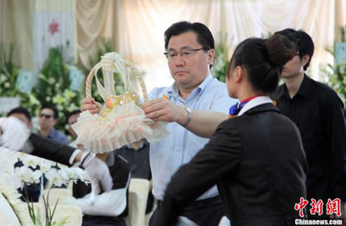 5月5日,台湾在嘉义市立殡仪馆为在阿里山小火车翻车事故中罹难的大陆游客举行公奠仪式,海旅会台北办事处主任刘克智祭奠逝者。沈存旭 摄