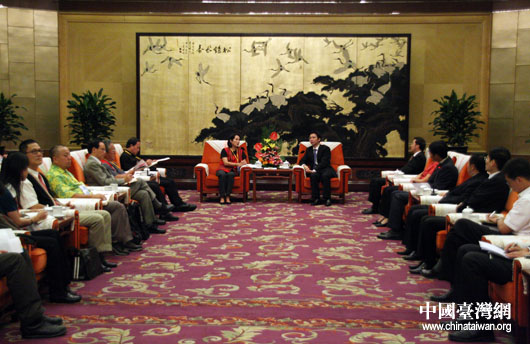 8月20日上午,在北京访问的台湾少数民族代表团在高金素梅的率领下拜会中国青少年发展基金会,青基会负责人贺军科表示欢迎。(中国台湾网 钟宝华 摄)