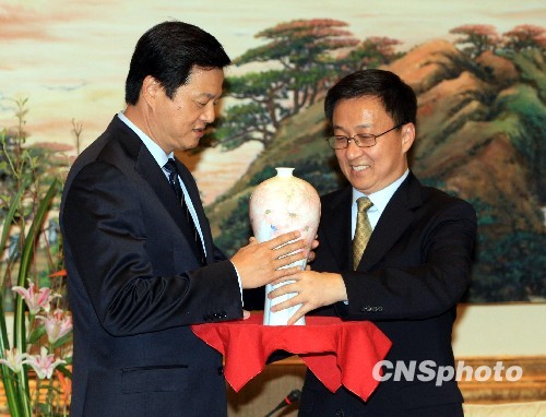 会见结束后,双方交换了礼品并合影留念。韩正送给客人的是上海生产的“倾心向阳”釉下彩汉光瓷瓶,台湾客人赠送的是一尊尚在运送途中的“红脸关公”工艺品。