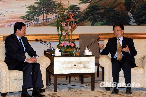 10月15日,上海市长韩正(右)在上海衡山宾馆会见台北县长周锡玮一行,双方就治理城市水污染问题进行了交流。周锡玮一行将在上海重点考察苏州河、洋山深水港等。 中新社发 潘索菲 摄