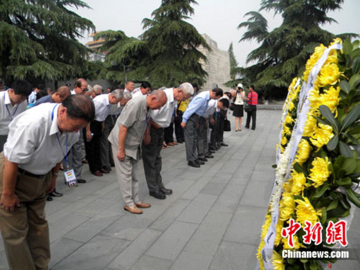 8月24日,海峡两岸及海外的黄埔同学、亲友相聚南京,参加“纪念抗日战争胜利65周年黄埔论坛”。当年的热血青年,如今已是耄耋老人,他们在侵华日军南京大屠杀遇难同胞纪念馆内参观,默哀并献花,寄托哀思。(图片来源:中新社 朱晓颖 摄)