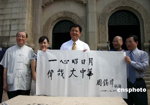 资料图片:2008年7月26日,台北县长周锡玮率台北县南京参访团一行拜谒南京中山陵,题字“一心昭日月,伟哉大中华”。中新社发 朱晓颖 摄