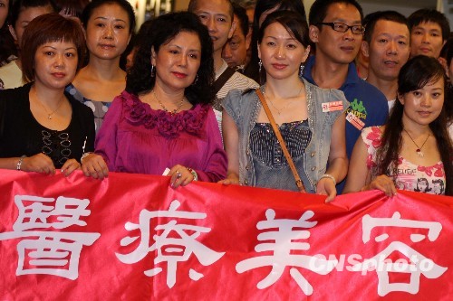 8月25日晚,中国大陆医疗美容百人首发团抵达台北,展开为期6天的医美、观展、观光、开会“四合一”体验行程。前排左二为团长、广州最佳女主角美容美体集团董事长林彩霞。 中新社发 董会峰 摄