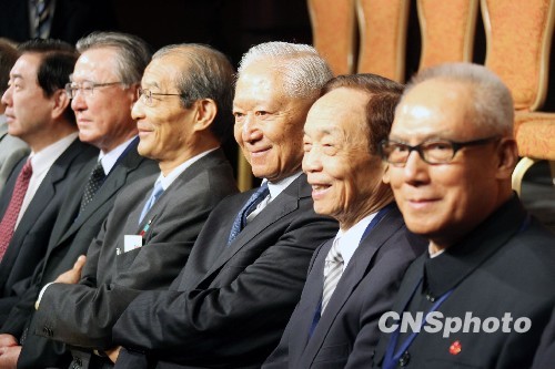 11月13日,为期两天的“两岸一甲子”学术研讨会在台北开幕。由于一百一十多位两岸与会学者中,有多位接近两岸决策核心的重量级智囊学者,而探讨的是两岸在政治、经济、文化、军事、涉外事务等领域的诸多敏感议题,研讨会广受媒体关注。图为中国战略与管理研究会会长、中共中央党校原常务副校长郑必坚(右三),中国孙子兵法研究会名誉会长李际均(右一)等与会专家学者合影。 中新社发 黄少华 摄