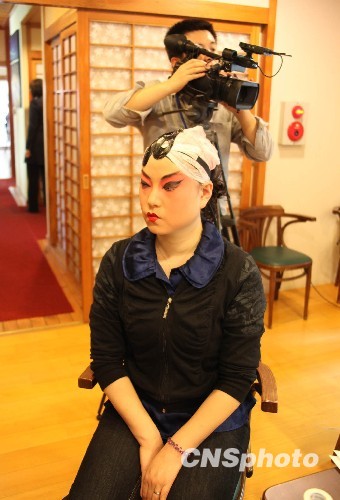 3月18日,来自兰州职业技术学院京剧团的女生在台北市长官邸为媒体反串表演了《铡美案》和《贵妃醉酒》的片段,以此揭开兰州职业技术学院将于19日在台北新舞台首演的序幕。图为扮演杨贵妃的女生在临时后台候场。中新社发 闫晓虹 摄