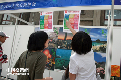 图为北京大学两岸文化交流协会展位的招贴海报吸引了学生驻足咨询。(中国台湾网 普燕 摄)