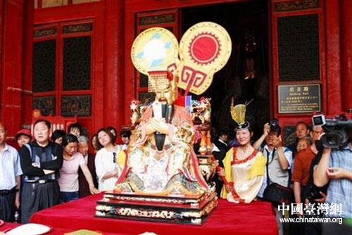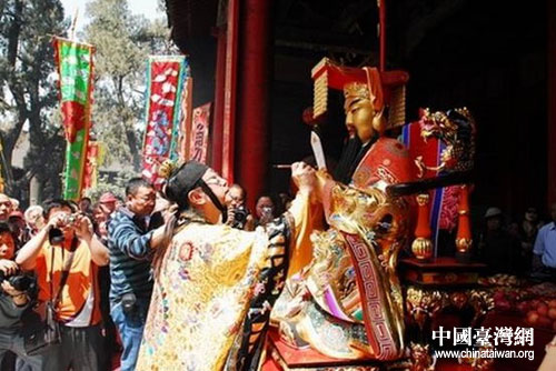 中国台湾网5月11日洛阳消息 洛阳关林耗资近100万元制作的关圣帝君神像,5月10日上午举行开光仪式,台湾圣盟堂大法师廖德鸿先生主持。据悉,该神像在供奉于洛阳关林正殿神像前附灵20天后,将起驾前往闽台巡游。