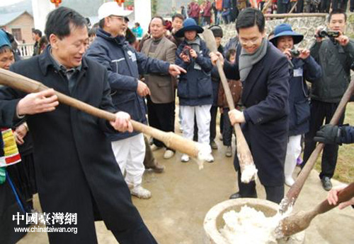 黔南州台办主任罗世云与慈济会负责人王运敬一起打粑粑(黔南州台办通讯员 韦应章 摄)
