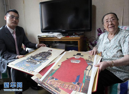 8月14日,孔子77代嫡孙女孔德懋(右)在北京家中介绍明清孔子嫡孙后裔画像。当日,生活在台北市的孔子79代嫡孙孔垂长一行五人在首次在北京与孔子77代嫡孙女、95岁高龄的孔德懋女士相聚。孔垂长一行是首次代表已故孔子77代嫡孙孔德成来内地在山东曲阜市孔林祭祖后到北京与孔德懋女士相聚。新华社记者 汪永基 摄