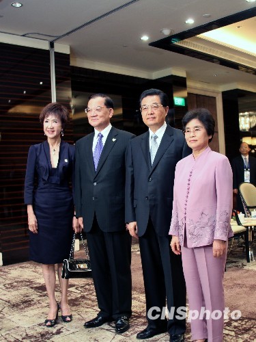 11月14日上午,中共中央总书记胡锦涛在新加坡会见中国国民党荣誉主席连战。图为胡锦涛和夫人刘永清与连战和夫人连方瑀合影。 中新社发 周兆军 摄