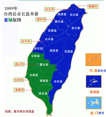 注:蓝色为国民党执政县市,绿色为民进党执政县市,花莲县为脱离国民党的无党籍人士当选。