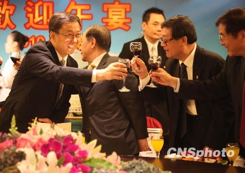 4月6日,刚刚抵达台湾的上海市长韩正在下榻的台北晶华酒店,出席上海台协会、台北浦东同乡会、崇明同乡会的联合宴请,在台北与台商、乡亲见面,乡音乡情浓。 中新社发 罗钦文 摄