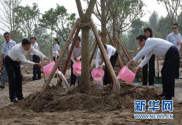 6月30日,陈云林(前右)、江丙坤(前左)在重庆照母山植物园为“合作共赢树”浇水。当日,海峡两岸关系协会会长陈云林与台湾海峡交流基金会董事长江丙坤来到重庆照母山植物园,共同种下了“合作共赢树”,庆祝双方成功签署《海峡两岸经济合作框架协议》《海峡两岸知识产权保护合作协议》。新华社记者 陈诚摄