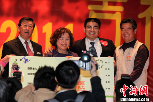 图为陈光标(右2)应邀参加新竹县政府举办的岁末送暖活动,“入乡随俗”改以支票形式分别致赠弱势团体及弱势儿童400万元新台币、60万人民币善款。中新社记者 董会峰 摄