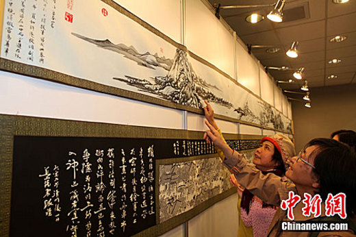 3月7日下午,出自大陆名家之手的长幅剪纸艺术作品《富春山居图》(上)、《清明上河图》,一同亮相张家口蔚县民俗文化艺术展,吸引台湾民众驻足欣赏、评头品足。中新社发 董会峰 摄