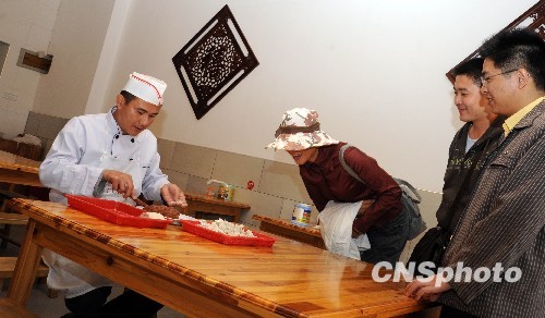 11月2日,福建沙县小吃知名品牌庙门扁肉第三代传承人王盛标在沙县小吃城内为慕名前来的宾客表演“超快”手工包扁肉的绝活。福建省三明市沙县,虽然土地面积不大,人口不多,但是却因为当地小吃,而名扬海内外。 中新社发 刘可耕 摄