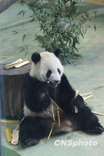 来台1年有余、被众观者赞誉为“超可爱”的大熊猫团团圆圆正在台北木栅动物园的新光熊猫馆过着和美的生活。临近25日傍晚时分,工作人员说已开始有发情迹象的圆圆常爱不停走动,几乎没有片刻停歇,她一会在水里冲凉,一会在地上打滚,一会又爬树来一个惊险倒立,引得观者一阵阵叫好。图为在隔壁和她分居的团团却年少不谙性事,只顾自地大快朵颐大嚼竹子,全然不理不睬圆圆,令人忍俊不禁。 中新社发 闫晓虹 摄