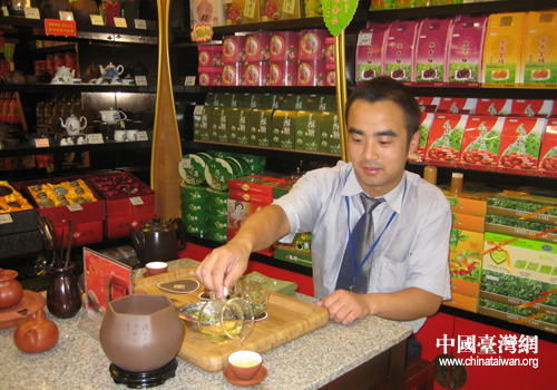 店长一边泡茶一边讲解茶文化 (图片来源:宁夏台办)