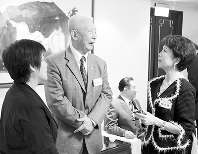 胡葆琳(右)、黄慧南(左)与台湾退役上将交谈。 连锦添摄
