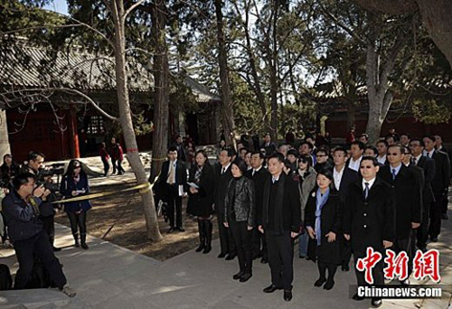3月25日上午,由中国国民党青工总会总会长何庆纹率领的中国国民党青工总会大陆参访团来到北京香山碧云寺,拜谒孙中山先生纪念堂及中山先生衣冠冢。中新社发 刘震 摄