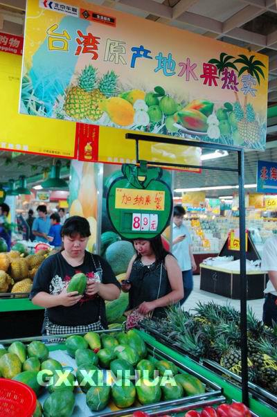 5月下旬,广西组织千人代表团赴台湾开展经贸文化交流,在此期间向台南县玉井乡农会购买了总共160多吨、价值1000多万元新台币的凤梨(菠萝)、芭乐(番石榴)和木瓜。6月3日起,这批水果开始在广西各地上市,受到很多市民的青睐。新华社记者 向志强 摄