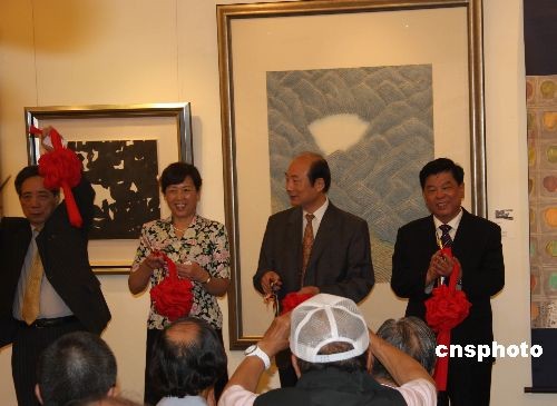图为中国文联副主席胡振民(右一)、中国文联港澳台办公室主任黄文娟(左二)、台北艺术大学校长黄光男(左一)为画展开幕剪彩。