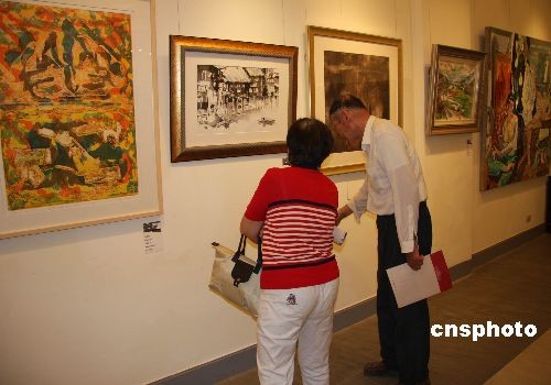图为台湾艺术爱好者在欣赏“海峡两岸绘画联展”。6月13日,中国文学艺术界联合会与台湾文艺协会联合举办的《世纪初艺术——海峡两岸绘画联展》,在台北美术界地位最尊贵的“孙中山纪念馆”中山画廊北室开幕,画展精选60位两岸顶尖艺术家的作品。中新社发 耿军 摄