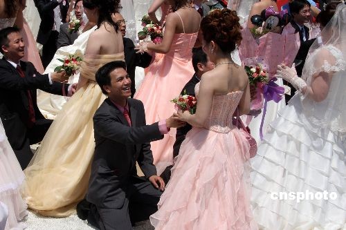 6月28日,50对新人顶着烈日,参加在台北县板桥市435艺文中心举行的露天集体婚礼,现场安排乘坐越野车入场、求婚、拥吻等环节,场面温馨而又火爆。图为众新郎右膝着地,向新娘献花、求婚。中新社发 董会峰 摄