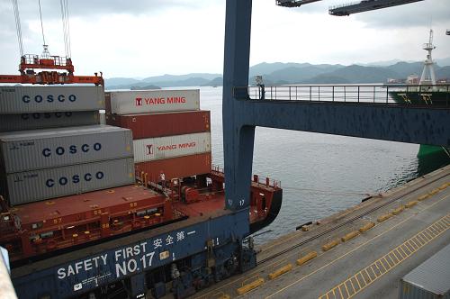 8月17日,装载活动板房的货船即将从深圳盐田港出发。新华社记者吴俊摄
