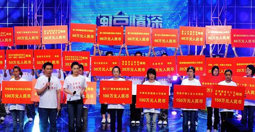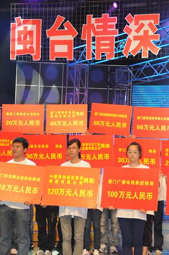 8月19日,社会各界在赈灾晚会上纷纷捐款献爱心。当日,福建省举行福建同胞援助台湾灾区赈灾晚会,帮助在台风“莫拉克”中受灾的台湾同胞渡过难关。福建省红十字会当晚接受社会各界捐助人民币8681万多元。新华社记者 张国俊 摄