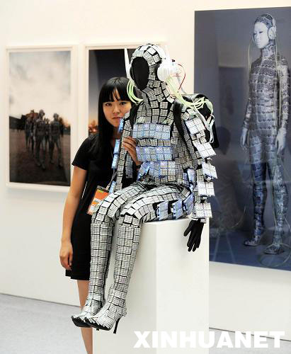 8月27日,在台北国际艺术博览会现场,日本行为艺术家山口典子展示她用1200片手机键盘制作的《手机女孩》。2009台北国际艺术博览会8月28日在台北开展,吸引了来自中国大陆和日本、韩国、芬兰、波兰、意大利等地的艺术家前来参展。据了解,本次博览会的门票收益以及艺术家捐赠作品的义卖收入将全部捐献给台湾灾区。新华社发(吴景腾 摄)