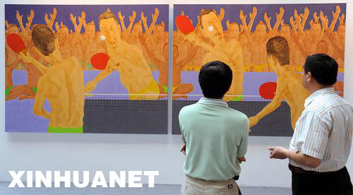 8月27日在台北国际艺术博览会现场拍摄的大陆画家钟山的作品《乒乒乓乓》。2009台北国际艺术博览会8月28日在台北开展,吸引了来自中国大陆和日本、韩国、芬兰、波兰、意大利等地的艺术家前来参展。据了解,本次博览会的门票收益以及艺术家捐赠作品的义卖收入将全部捐献给台湾灾区。新华社发(吴景腾 摄)