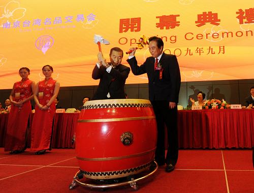 9月17日,海协会会长陈云林(前右)与台北世贸中心董事长王志刚(前左)共同擂鼓为交易会揭幕。当日,由南京市政府与台北世贸中心联合举办的“2009南京台湾名品交易会”在南京国际博览中心开幕。展会参展企业达到750家,其中台湾本土企业占73%,大陆台企占27%,是历年来台商企业产品在大陆最大规模的集中亮相。 新华社记者 姜帆 摄