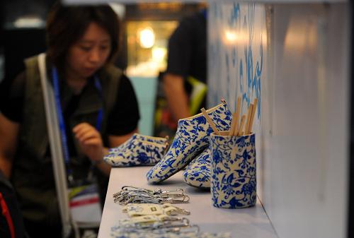 9月17日,一位买家在交易会上观看台商的“青花瓷”系列创意产品。新华社记者 姜帆 摄