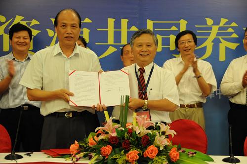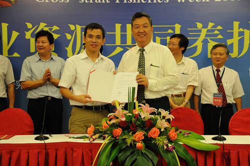 9月21日,福建省水产研究所代表(前排左)与台湾海洋大学代表(前排右)展示已签署的《两岸共同制定台湾海峡渔业资源养护方案意向书》。当天,两岸学界及海洋与渔业界人士在福州结束第四次“台湾海峡渔业资源共同养护与管理研讨会”之际,签署了《两岸共同制定台湾海峡渔业资源养护方案意向书》《海峡两岸海洋与渔业学术交流与合作意向书》《推动海峡两岸渔事纠纷调解备忘录》等三项合作意向,作为落实去年底在上海举行的第四届两岸经贸文化论坛提出“加强两岸渔业合作”的具体措施。新华社记者 来建强 摄