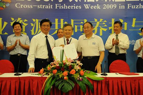 9月21日,福建省海洋学会代表(前排右)、福建省水产学会代表(前排左)与台湾海洋大学代表(前排中)签署《海峡两岸海洋与渔业学术交流与合作意向书》。新华社记者 来建强 摄