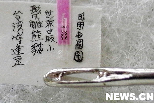 “团团与圆圆”发雕作品以及两根在直径约0.04mm的头发丝上刻画的大熊猫与普通缝衣针放置在一起(10月16日摄)。