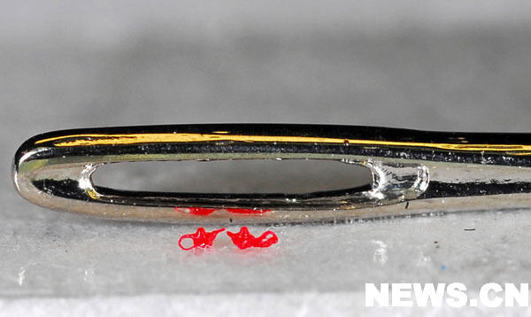 用宝石灰尘雕刻出的长0.5mm、宽0.3mm、高0.4mm的两只微雕茶壶与普通缝衣针放置在一起(10月16日摄)。