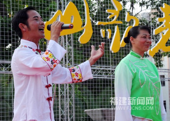10月17日下午,闽西山歌手李银兰、许开聪在海峡两岸客家山歌赛上原汁原味的山歌表演深情并茂、获得该赛事第一名。当日,海峡两岸客家山歌赛在客家祖地福建上杭县举行,17位来自海峡两岸的山歌手参加了该比赛。两岸客家山歌手拉歌、情歌对唱,高潮迭起,吸引近千民众争睹。(记者 刘可耕 摄)