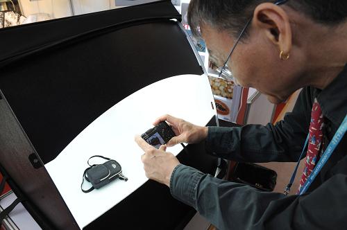 10月17日,一位采购商在试用台湾产的迷你型摄影棚。在第106届广交会上,我国台湾参展企业积极开拓大陆市场,参展企业数量达到52家。新华社记者 卢汉欣 摄