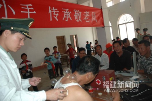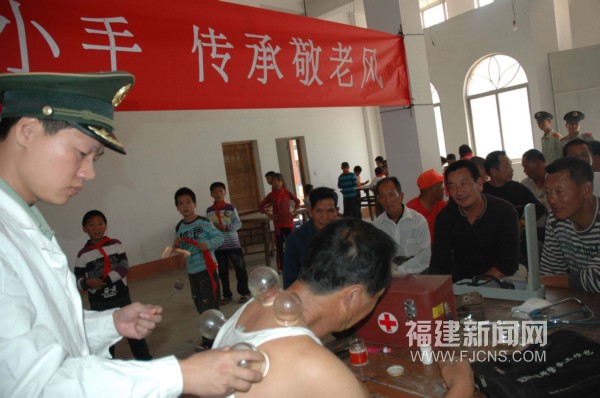 中国传统的敬老节--“九九重阳节”到来前夕,10月25日,福建省福清南青屿边防派出官兵联合近百名船舶停靠当地码头的台胞、当地小学生一起开展了“大手牵小手 传承敬老风”欢庆重阳节活动。当日上午,边防官兵与20余名小学生及10多名台胞到当地孤寡老人家里话家长、量血压、包饺子、煮寿面等活动欢庆重阳节,受到了老人们的热烈欢迎。(孙旭晖 连仁良)