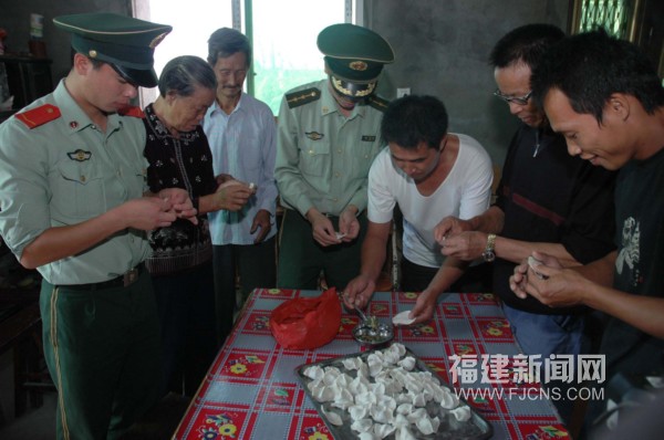 福清南青屿赤表村84岁高龄的林金钿老人和福清南青屿边防官兵、台胞等一起包饺子。