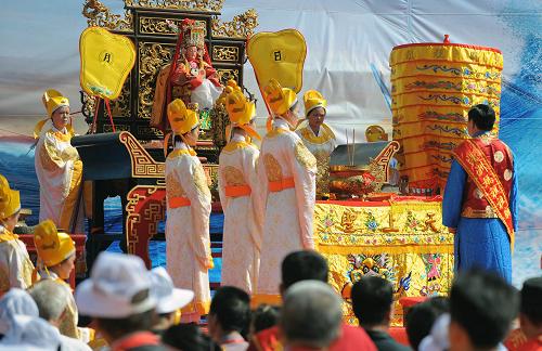 11月1日,湄洲妈祖文化旅游节上举行祭典妈祖活动。当日,以庆祝妈祖信俗成功申报人类非物质文化遗产为主要活动内容的第十一届中国湄洲妈祖文化旅游节在妈祖故乡福建湄洲岛开幕。来自海内外26个国家和地区的万余名中华儿女齐聚湄洲岛,围绕“同谒妈祖,共享平安”的主题,举行包括妈祖祭典、海峡妈祖文化旅游推介会和第五届湄洲妈祖海峡论坛等内容的活动。新华社记者姜克红摄